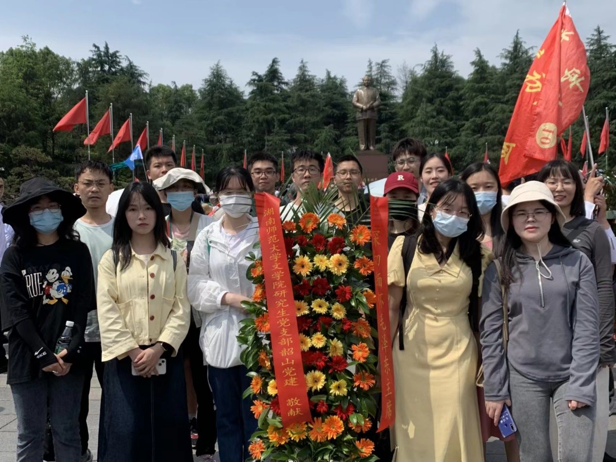 (通讯员 张春晓)2023年5月13日,英国上市官网365研究生古代文学文献学党支部在湖南省韶山市开展主题党日活动——“瞻仰伟人风范,弘扬革命精神”。活动由党支部书记张春晓组织,组织委员覃子壹等同志协调负责,参与活动的对象有党支部部分党员和团员,共计十七人。