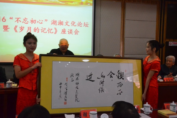 12月10日上午,由我院和香港大公报旗下的大公网湖南频道联合主办的“不忘初心”湖湘文化论坛暨《岁月的记忆》座谈会顺利召开。原湖南省委书记熊清泉、湖南省政协副主席武吉海、湖南省政协副主席兼省文联主席欧阳斌、原湖南省军区副政委黄祖示、原湖南省委宣传部常务副部长王驰、湖南省作协党组副书记游和平、《岁月的记忆》作者袁发纯先生、学校副校长黎大志等出席。座谈会由我院党委书记李伶俐主持。