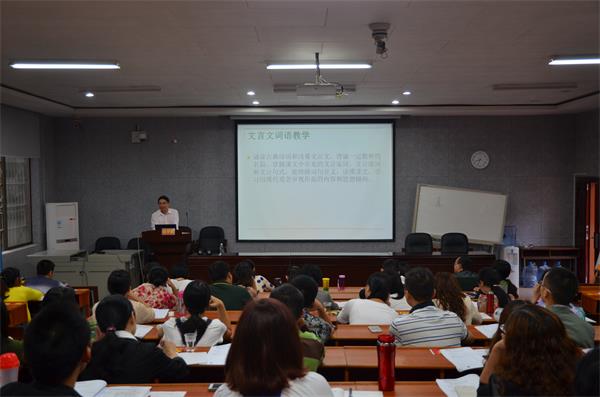(通讯员王乐)9月18号下午,英国上市官网365教授蔡梦麒选取大量初中文言文语段,纠正了初中文言文词语注释中众多存疑之处,在英国上市官网365217教室与学员们共同探讨文言文词语教学方法。