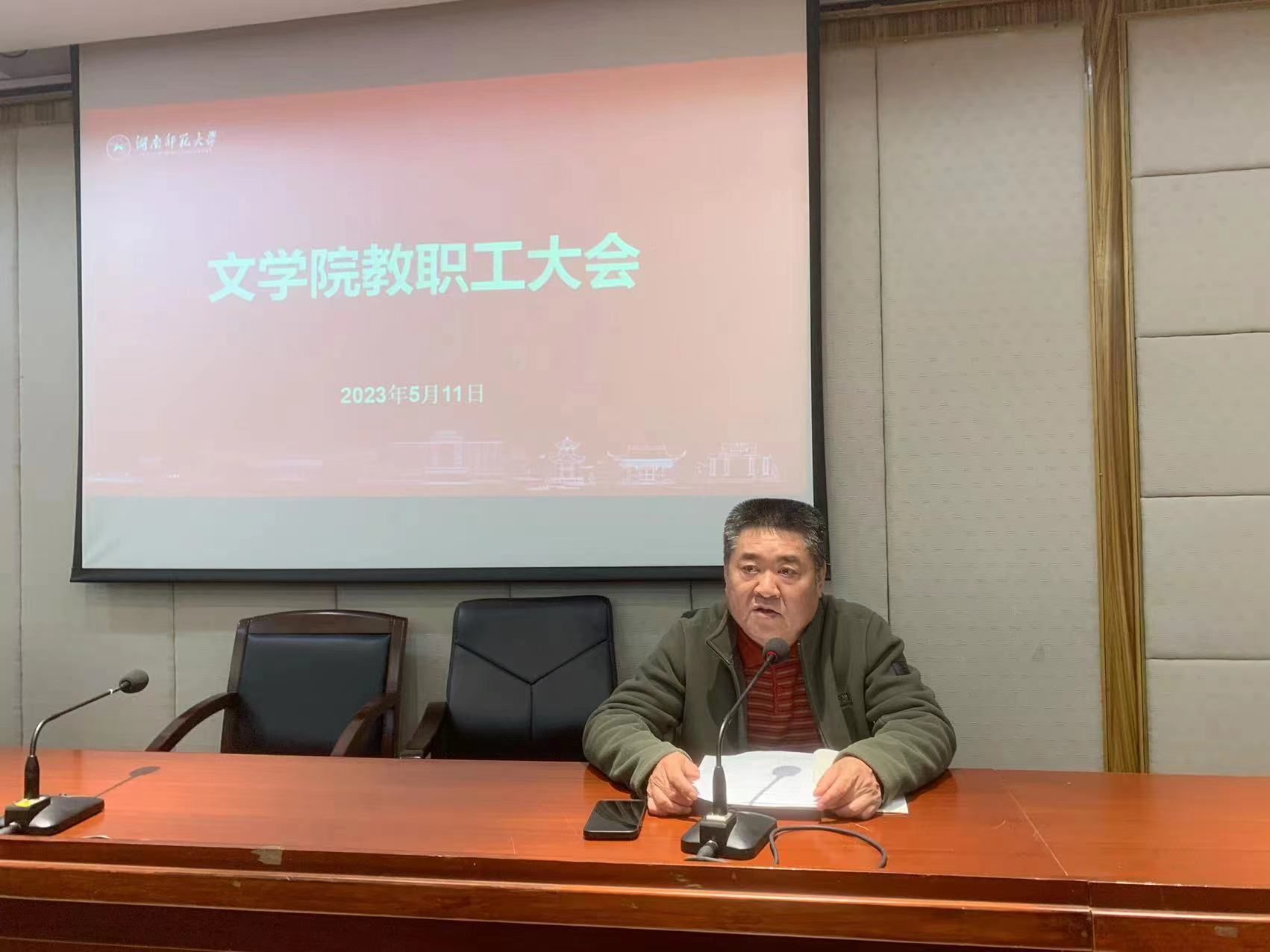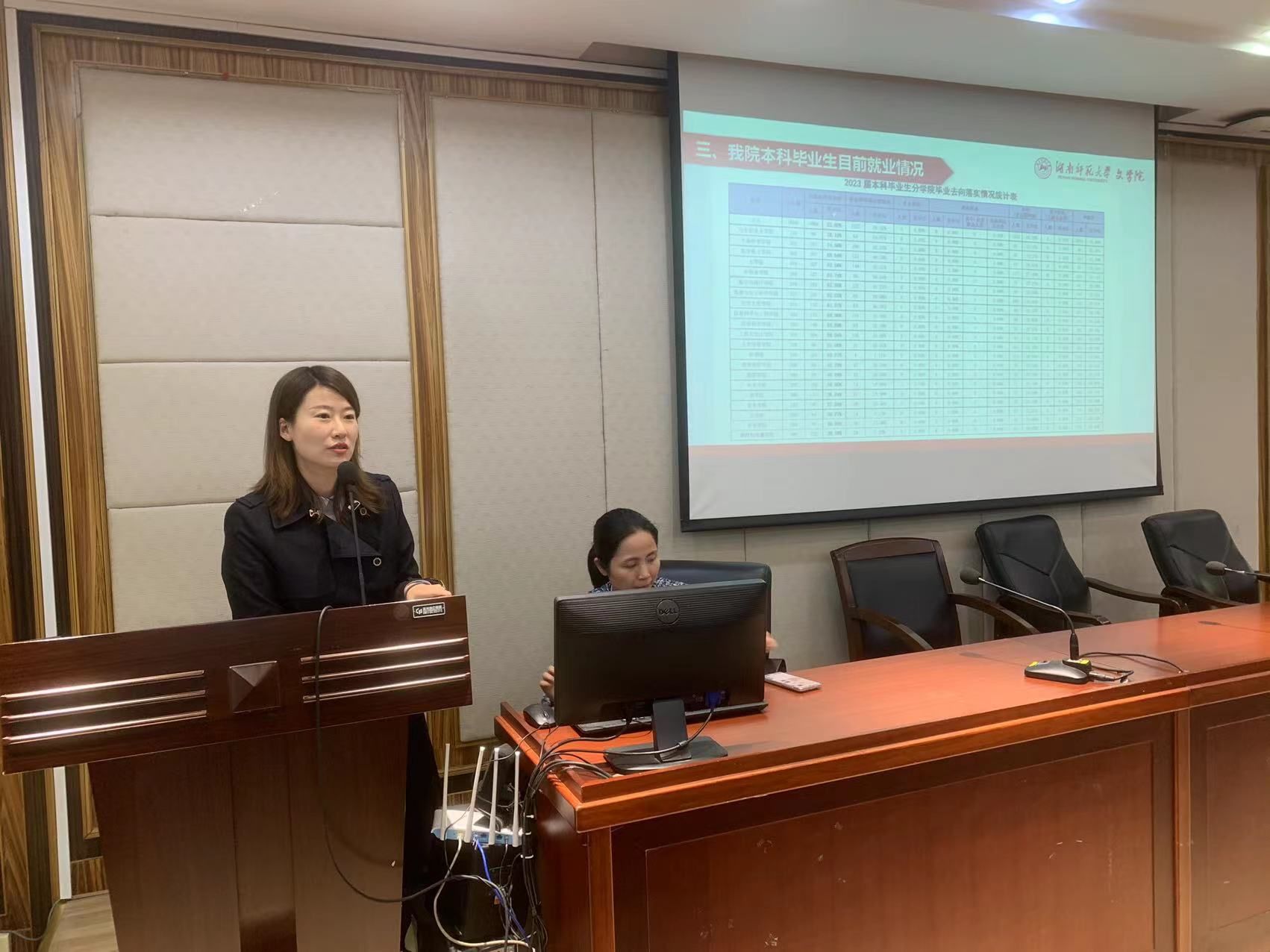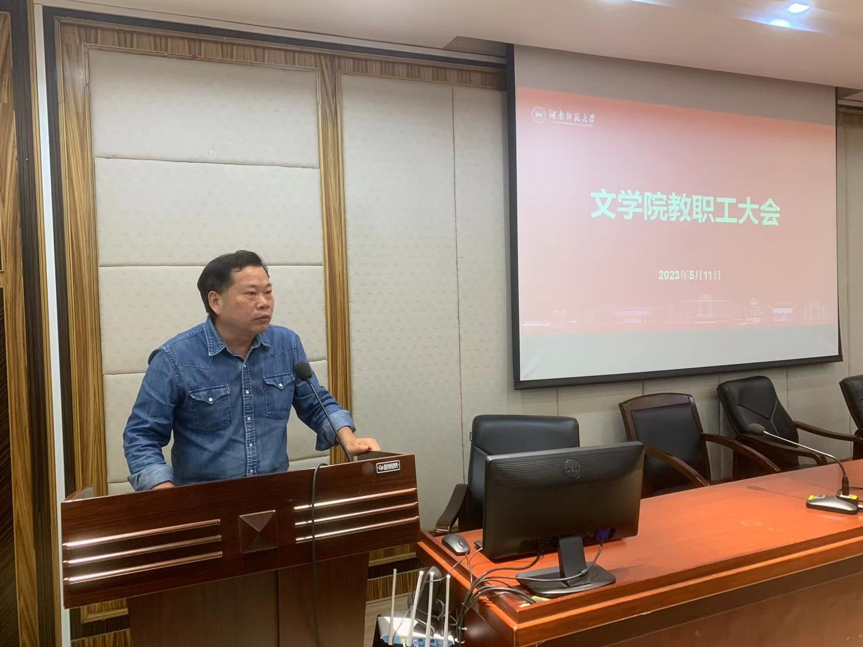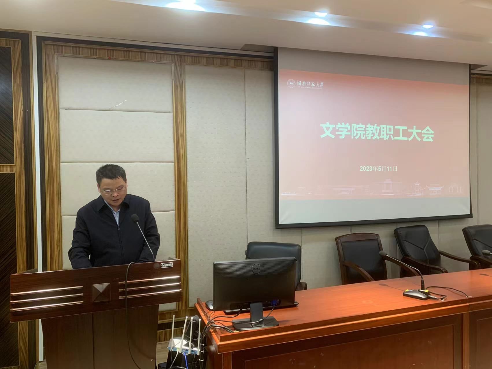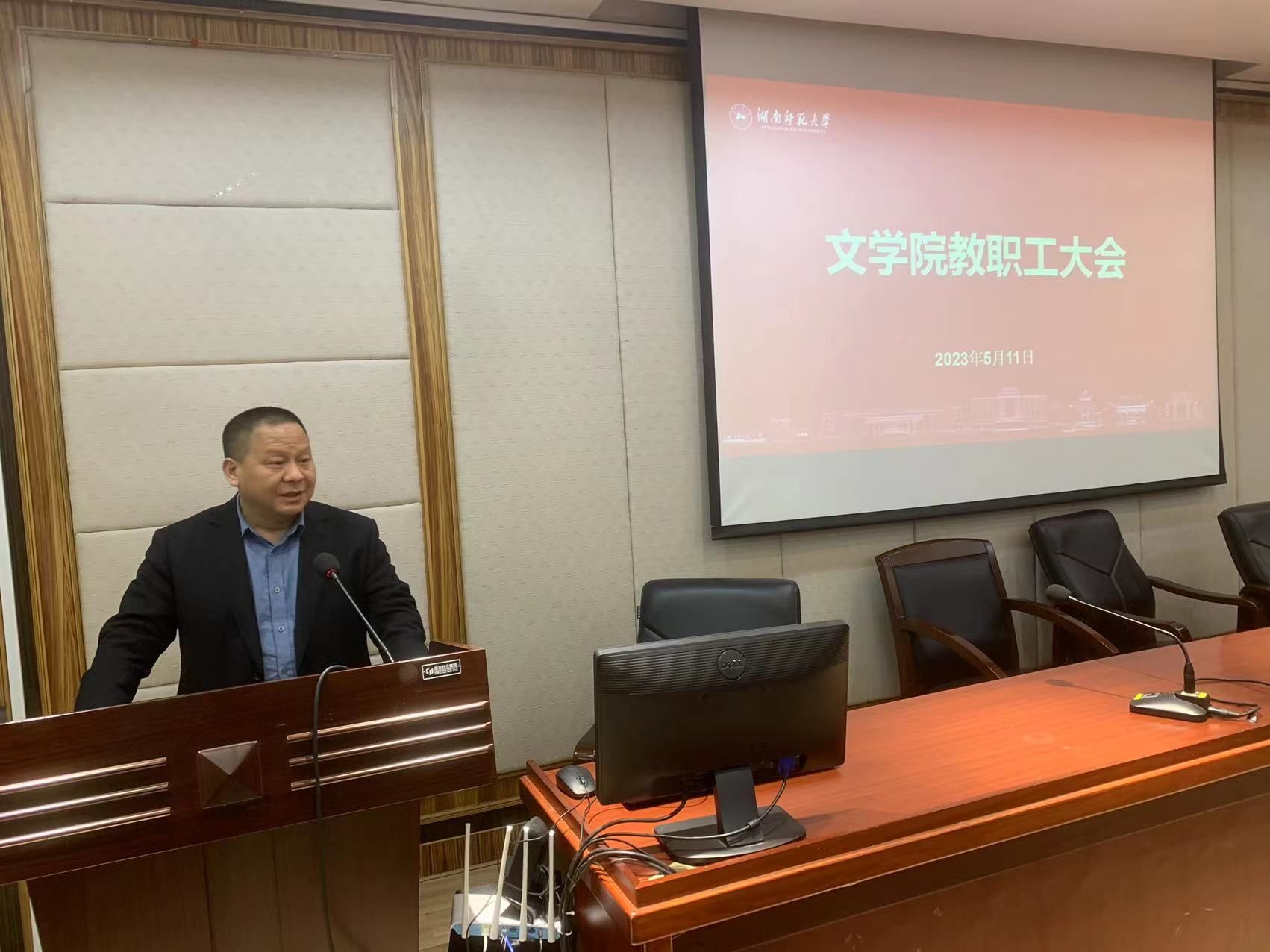 院党委副书记刘宓蜜报告了2023届本科生就业情况;副院长徐朝红报告了2023届研究生就业情况;副院长岳凯华报告了即将进行的本科教育教学审核评估工作;院长肖百容作总结讲话,对就业、人才培养、学术讲座等学院重点工作进行了强调和部署;李伶俐通报了湖南省高校“以学谋私”专项整治有关情况和“学习贯彻习近平新时代中国特色社会主义思想主题教育”进展情况,并对学院主题教育工作提出明确要求,作出具体安排。