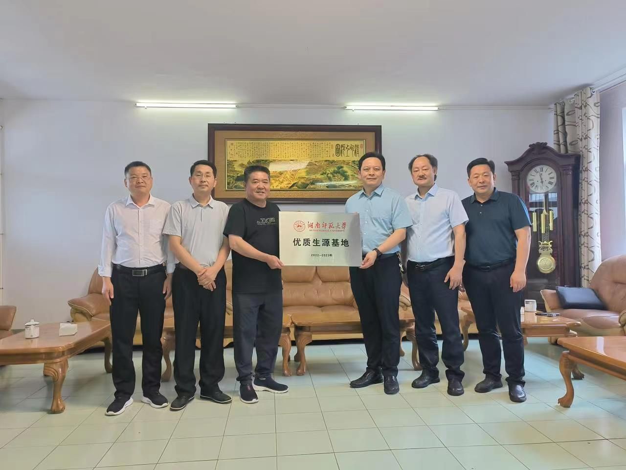 5月31日上午,在岳阳县一中接待室举行了简单隆重的授牌仪式,李伶俐、徐朝红隆重将“英国365上市公司优秀生源”基地授予岳阳县一中党委书记陈灏和校长续鹏飞。陈书记和续校长分别报告了学校的办学历史和现状,仪式结束后,续校长陪同学院领导一行认真参观了岳阳县一中的校园。下午参观了岳阳县渔业公司和洞庭旅游公司,了解师大毕业生的表现情况,听取了对学生培养和就业的需求和建议。晚上看望了校友代表——岳阳市人大副主任田文静、岳阳县委书记肖湘晖等,校友们深情回顾了在学校生活的点点滴滴,蔡炳华、彭万福给校友送上公司开发的文旅纪念品。