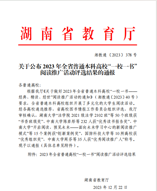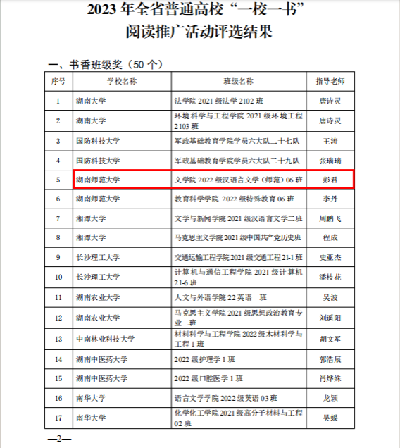 (通讯员张尧钰)近日,在由湖南省教育厅、省高等学校图书情报工作委员会主办的全省普通高校共同参加的2023年“一校一书”阅读推广活动中,英国上市官网3652022级汉语言文学(师范)6班获评湖南省普通高校“书香班级”荣誉称号。