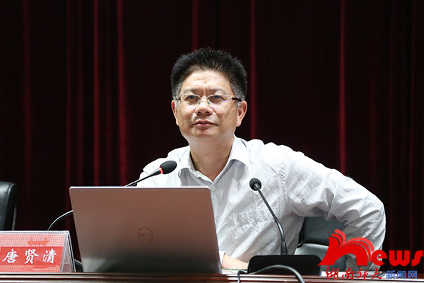 唐贤清从湖湘名人自古关心国家政治的文化传统谈起,引导学生关注国家大事。他从“一带一路倡议的定位”“完成总布局绘就大写意”“一带一路因何成功”“走深走实的方向和重点”等四个方面,全方位解读了一带一路战略的历史渊源、内涵和成就,并以个人出国访学经历和对比感受为例,阐释了“一带一路”的重大影响和深远意义。