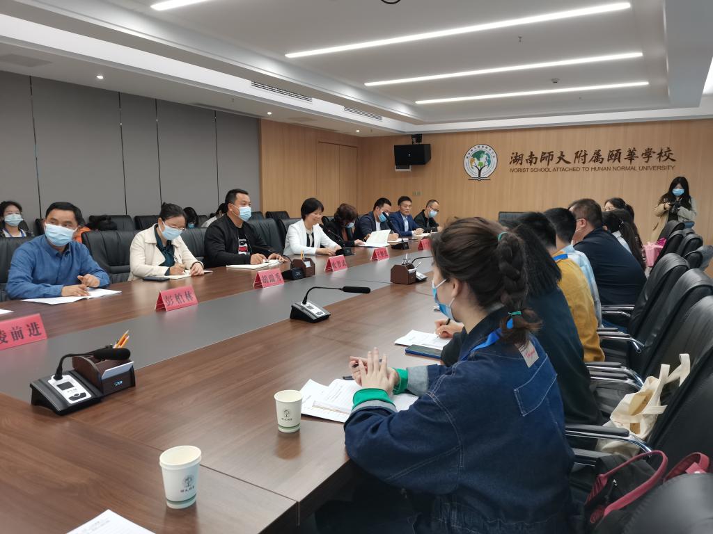 湖南师大附属颐华学校高中部校长王朝霞、初中部校长欧智武、高中部教学中心副主任段芳芳、初中部教学中心副主任胡瑞秀、初中部德育中心副主任余伦光等相关负责人,实习队指导老师王健以及实习队全体队员参加会议。