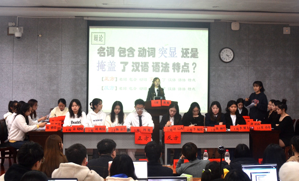 这场辩论赛不同于常见的8人辩论赛,共有18名辩手。本次辩论赛的题目是“名词包含动词突显还是掩盖了汉语语法特点?”。双方选手围绕这个辩题展开了激烈的辩论,经过了立论陈述、观点质询、攻辩、小结、自由辩论、总结陈述6个环节,充分展现了双方辩手扎实的专业水平和优秀的口才艺术。中途,语言学硕士生刘星漫和彭庆演唱了日语歌曲《それが大事》,语言学硕士生邓婉滢、寇婕、张馨月、朱淑琪演唱了歌曲《郎的诱惑》。整场辩论赛气氛热烈,互动频繁,线下掌声不绝,线上点赞不断。