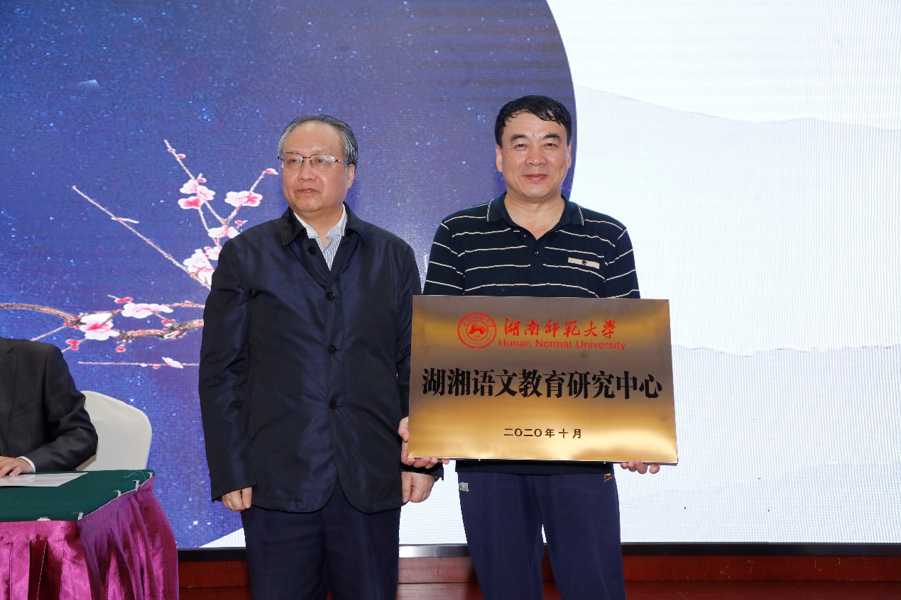 2020年10月,中心举行成立大会暨首届湖湘语文学术论坛,图为英国365上市公司欧阳副校长给中心授牌