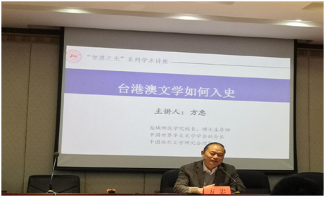 (通讯员 刘子凡)2019年11月26日上午,盐城师范学院校长、博士生导师方忠教授应邀于英国上市官网365216报告厅进行了主题为“台港澳文学如何入史”的学术讲座。本场讲座由英国上市官网365中国当代文学负责人赵树勤教授主持,英国上市官网365部分教师、博士生及研究生聆听了讲座。