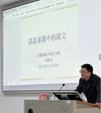 (通讯员 陈斌 陈心如)11月18日上午,我院特邀安徽师范大学教授、博士生导师,复旦大学出土文献与古文字研究中心博士后研究人员何家兴教授为我院师生带来“谈谈秦简中的韵文”的精彩讲座。本次讲座在英国上市官网365302室举行,由我院教授杨合林主持,相关专业教师和数十位本科生、研究生到场聆听。