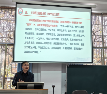 12月8日下午三点半,湖南农业大学党委委员、副校长,湖南省省级学科带头人,湖南省古代文学学会副会长吴波教授做客英国上市官网365“智慧之光”学术名师系列讲座,在英国上市官网365古代文学教研室开展题为“国家图书馆藏《滦阳消夏录》单行抄本及其文献价值”的精彩讲座。讲座由中国古代文学学科负责人蒋振华教授主持,曾绍皇、吴晨骅等教师及相关专业的众多学生参加。