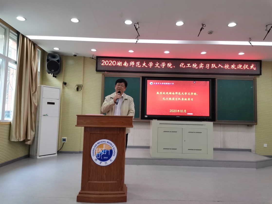 会议伊始,刘欣校长致辞,介绍了长梅中学的办学历史与规模,畅谈学校的“绿色”教育理念,并分享了学校在立德树人方面的佳绩与社会美誉度。同时,鼓励每一位实习老师,踏实认真完成好实习工作。最后他还强调“进了长梅门,就是长梅人” ,表示了对实习队师生最真诚的欢迎。