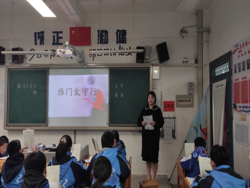 在公开课中,实习队代表夏迪伦为1912班讲授了《雁门太守行》。她从儿时启蒙读物《唐诗三百首》导入,引导同学们思考:为何李贺的诗没出现在“唐三百”中?课堂上,夏迪伦通过走进作者、内容感知、思想情感与价值观三个方面分析诗歌,在讲解诗歌内容的同时,穿插用典、视听觉描写、修辞手法的介绍,运用朗诵、讨论等方法,使课堂生动有趣又富于文学性。“诗鬼”其“鬼”在何处?课堂的前半部分回答了导入的疑问,将诗歌带入了第二部分,从色彩部分引导同学们思考思想情感,联系疫情的实际,使课堂不限于文本之上。