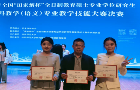 2025年11月7日至9日,2025年全国“田家炳杯”全日制教育硕士专业学位研究生学科教学(语文)专业教学技能大赛决赛在杭州师范大学举行。我院蒋梦薇、帅微琴两位选手发扬拼搏精神,展现了优秀的教学技能,分别荣获二等奖、三等奖。“田家炳杯”教育硕士教学技能竞赛是目前该领域国内层次最高、专业性最强、规模最大、影响最广的全国赛事。本次大赛由全国教育硕士研究生教学技能大赛专家委员会指导,田家炳基金会冠名赞助,杭州师范大学承办。初赛共有来自128所高校575位选手参加,其中173名选手入围决赛。最决赛评选一等奖16名、二等奖32名、三等奖64名。
